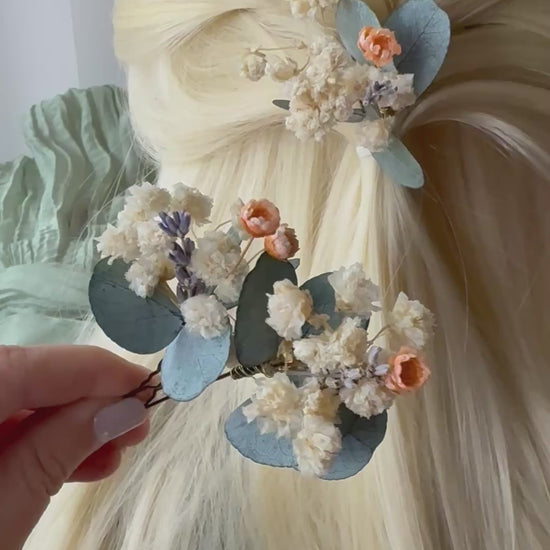 Delicate and romantic, this handcrafted floral hair accessory set in orange & eucalyptus tones is perfect for weddings, photo shoots, and special occasions. Whether you're a bride, bridesmaid, or flower girl, these elegant pieces will add a touch of boho charm to your look.