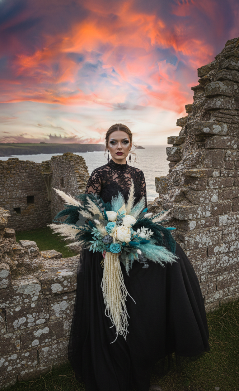 This exquisite bouquet seems to capture the breath of the steppe wind and the warmth of a sunny day. Its palette intertwines shades of milky silk, ivory, and vanilla cream, softly contrasting with deep turquoise tones reminiscent of ocean waves in the morning sunlight.